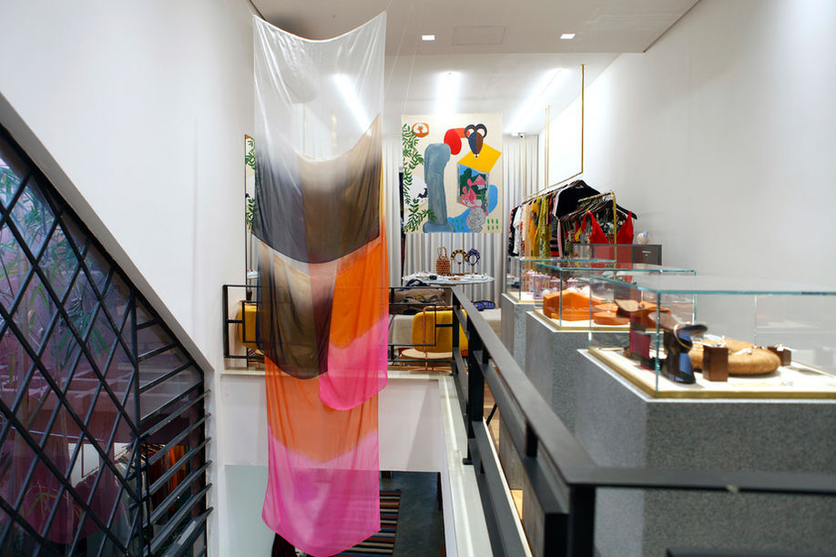 Com o mesmo material do lenço, sedas aparecem no ambiente em maior escala, arquitetonicamente os tecidos tingidos atravessam o espaço configurando novas áreas, novas paisagens que expandem o universo desse conto para sua concretização no real.